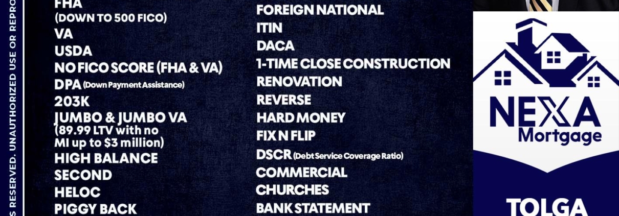 Hi, my name is Tolga Cinar. I’m a Loan Officer with NEXA Mortgage LLC., offering personalized mortgage solutions, fast customized quotes, great rates and service with integrity.