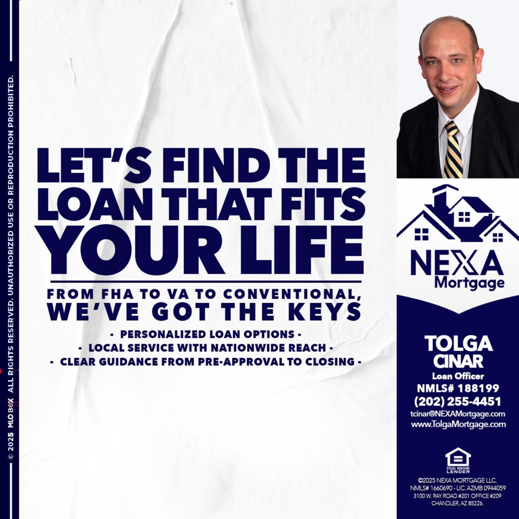 Hi, my name is Tolga Cinar. I’m a Loan Officer with NEXA Mortgage LLC., offering personalized mortgage solutions, fast customized quotes, great rates and service with integrity.