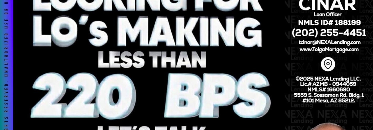 LOOKING FOR - Tolga Cinar -Mortgage Loan OriginatorHi, my name is Tolga Cinar. I’m a Loan Officer with NEXA Lending LLC., offering personalized mortgage solutions, fast customized quotes, great rates and service with integrity.