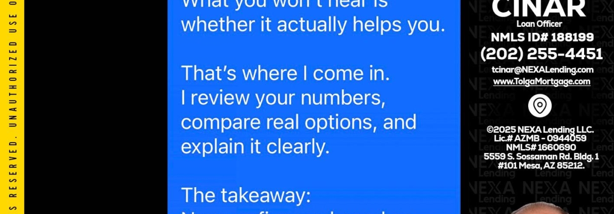 Hi, my name is Tolga Cinar. I’m a Loan Officer with NEXA Lending LLC., offering personalized mortgage solutions, fast customized quotes, great rates and service with integrity.