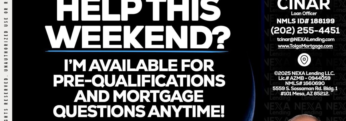 REAL ESTATE AGENTS - Tolga Cinar -Mortgage Loan OriginatorHi, my name is Tolga Cinar. I’m a Loan Officer with NEXA Lending LLC., offering personalized mortgage solutions, fast customized quotes, great rates and service with integrity.