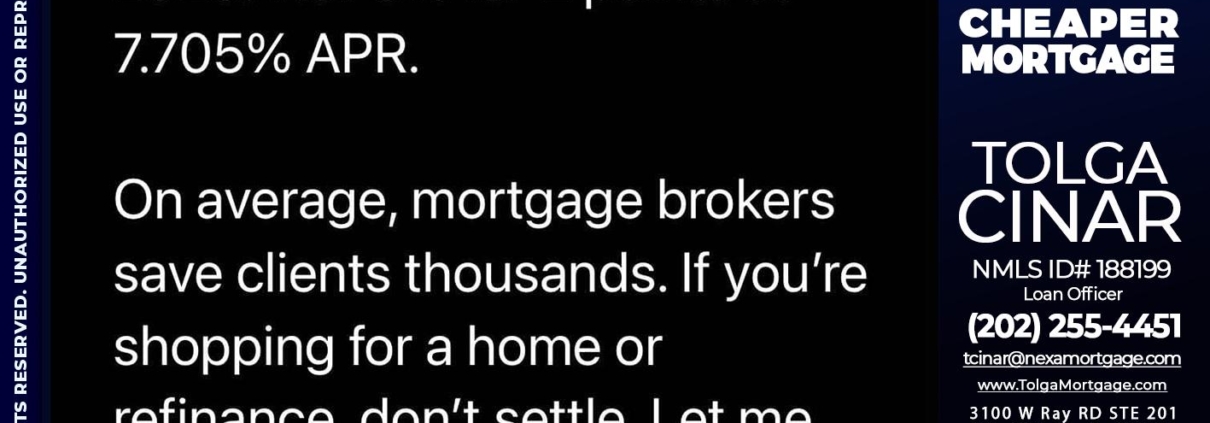 Hi, my name is Tolga Cinar. I’m a Loan Officer with NEXA Mortgage LLC., offering personalized mortgage solutions, fast customized quotes, great rates and service with integrity.